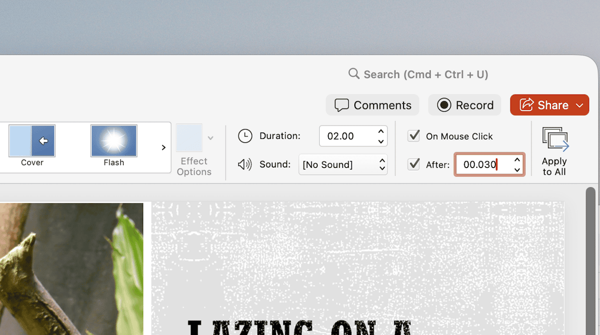- Check the ‘After’ option and input a time after which the transition will begin. Note that the time is specified in minutes and seconds, so if you want a slide to last 30 seconds, input 0:30. You can also uncheck the On Mouse Click Box. If you also want to specify the duration of transitions, enter a value in that box.