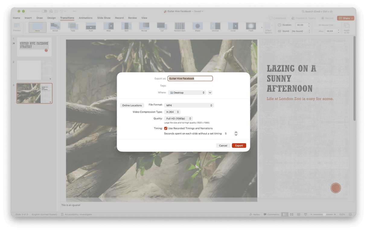 Once you’ve checked everything in your presentation is as it should be and you’ve specified timings for slides and transitions, you can export the presentation: