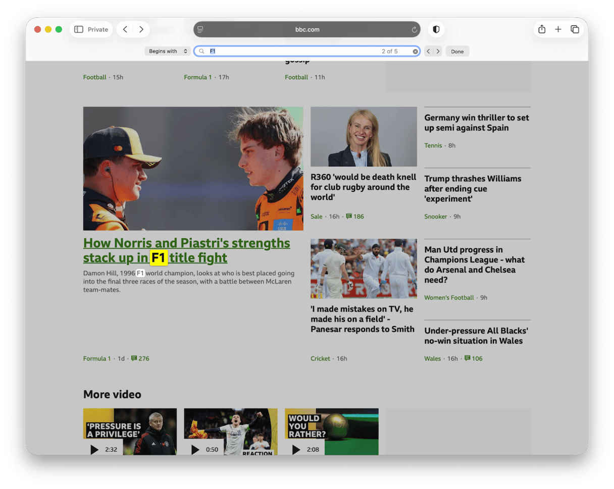 - Multiple frames or iframes on a page. Click inside the main article area first, then Command - F so the browser searches the correct frame.
