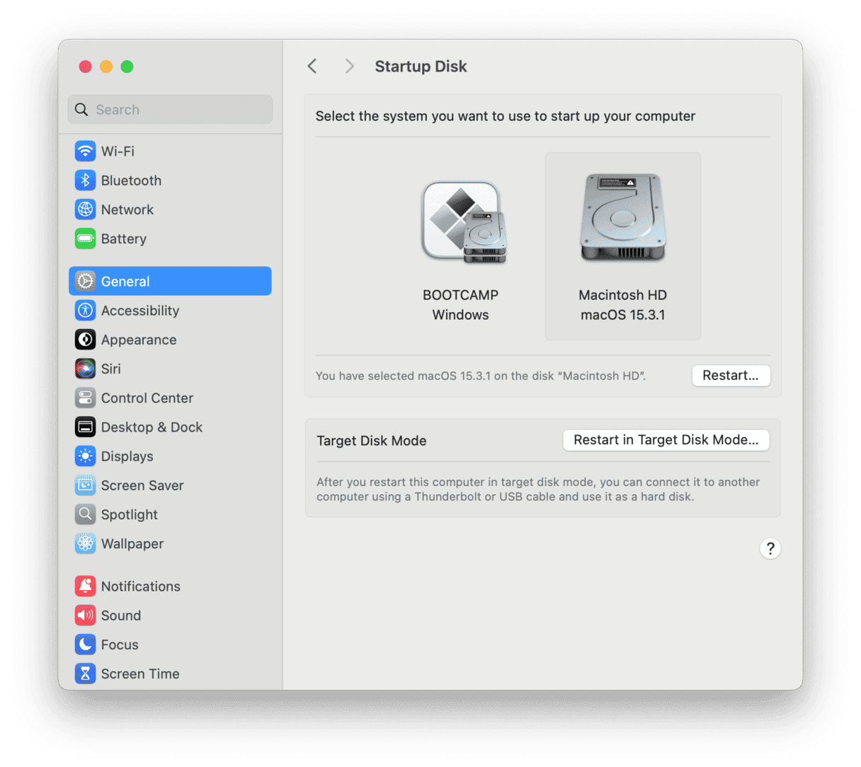 Once you’ve connected the two Macs, go to System Settings on the old Mac, click General > Restart in target disk mode. Or, if the old Mac is powered off, boot it while holding the “T” key. The old Mac will now mount as a disk volume on the new Mac.