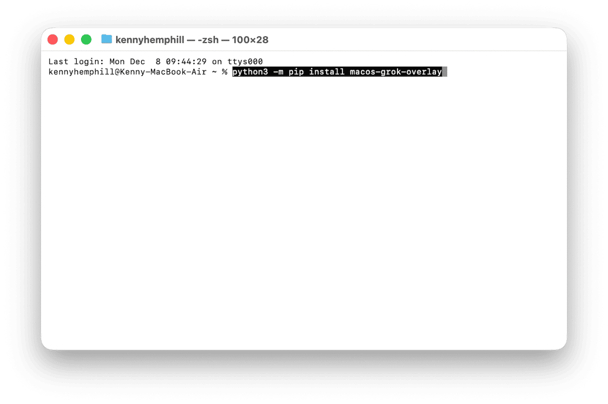 python3 -m pip install macos-grok-overlay - If you want the background task to launch at login, paste this command and press Return: