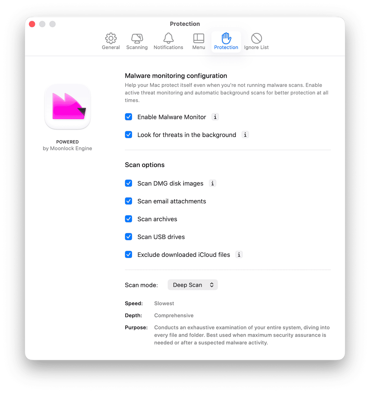 We recommend the Protection Manager in CleanMyMac. It uses Moonlock Engine to check for malware and allows you to scan your Mac’s startup disk as well as USB drives, email attachments, and disk images. You can configure it to scan whatever you like and can also choose between a quick scan, a deep scan, or a balanced scan, which is a combination of the two.