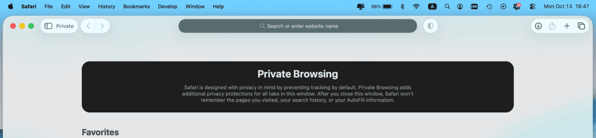 A new blank Safari window will open. It looks like any others, except the address bar is darker. Safari will also display that this is a private browsing window at the top.