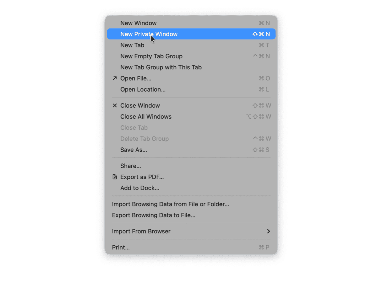 - Go to File > New Private Window from the menu bar. Another way to do this is to click Shift+Command+N using your keyboard shortcuts.