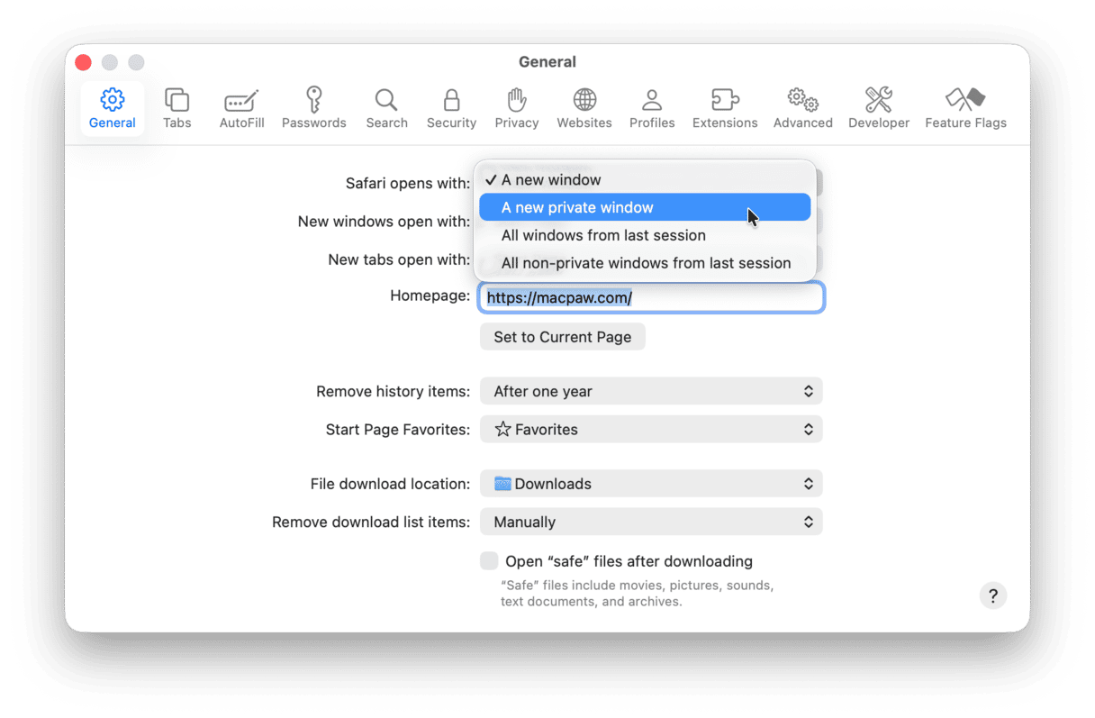 - From the General tab of Settings, locate the drop-down option called “Safari opens with:” and set this to “A new private window.”