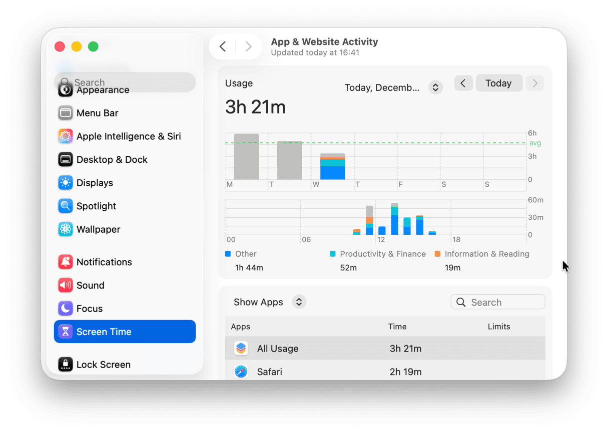 So when you use Screen Time on Mac, you can not only set limits for your social media use and the like, but you might also notice time-wasting patterns that could be instantly fixed with optimization software like CleanMyMac.