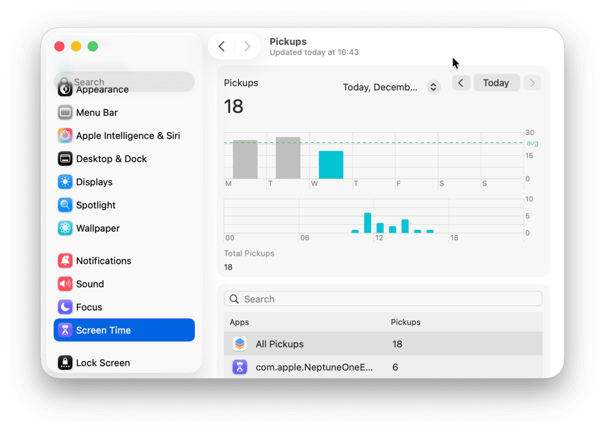 In addition, moving to the Notifications tab will uncover the most attention-seeking apps that you can choose to quickly silence via Notifications in the System Settings. Lastly, Pickups shows you how often you turn to your computer and which apps are the first to be opened. Naturally, you might want this to be your work browser instead of the latest video game.