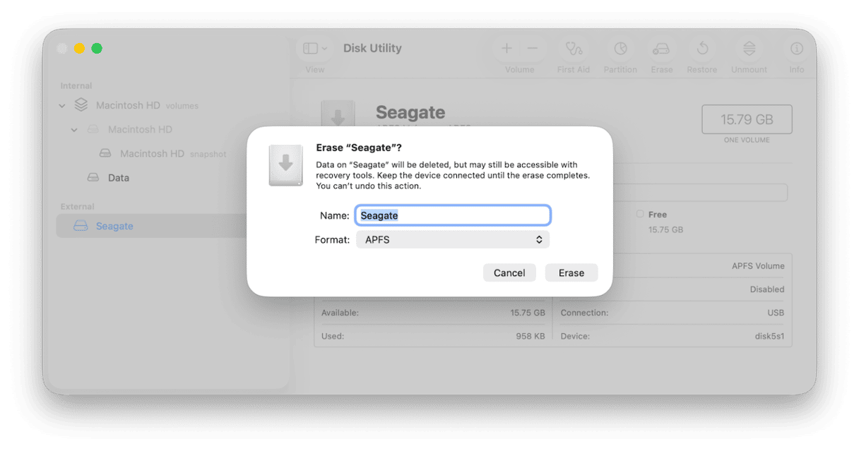 - Select the Seagate portable drive in the sidebar and click Erase in the toolbar.