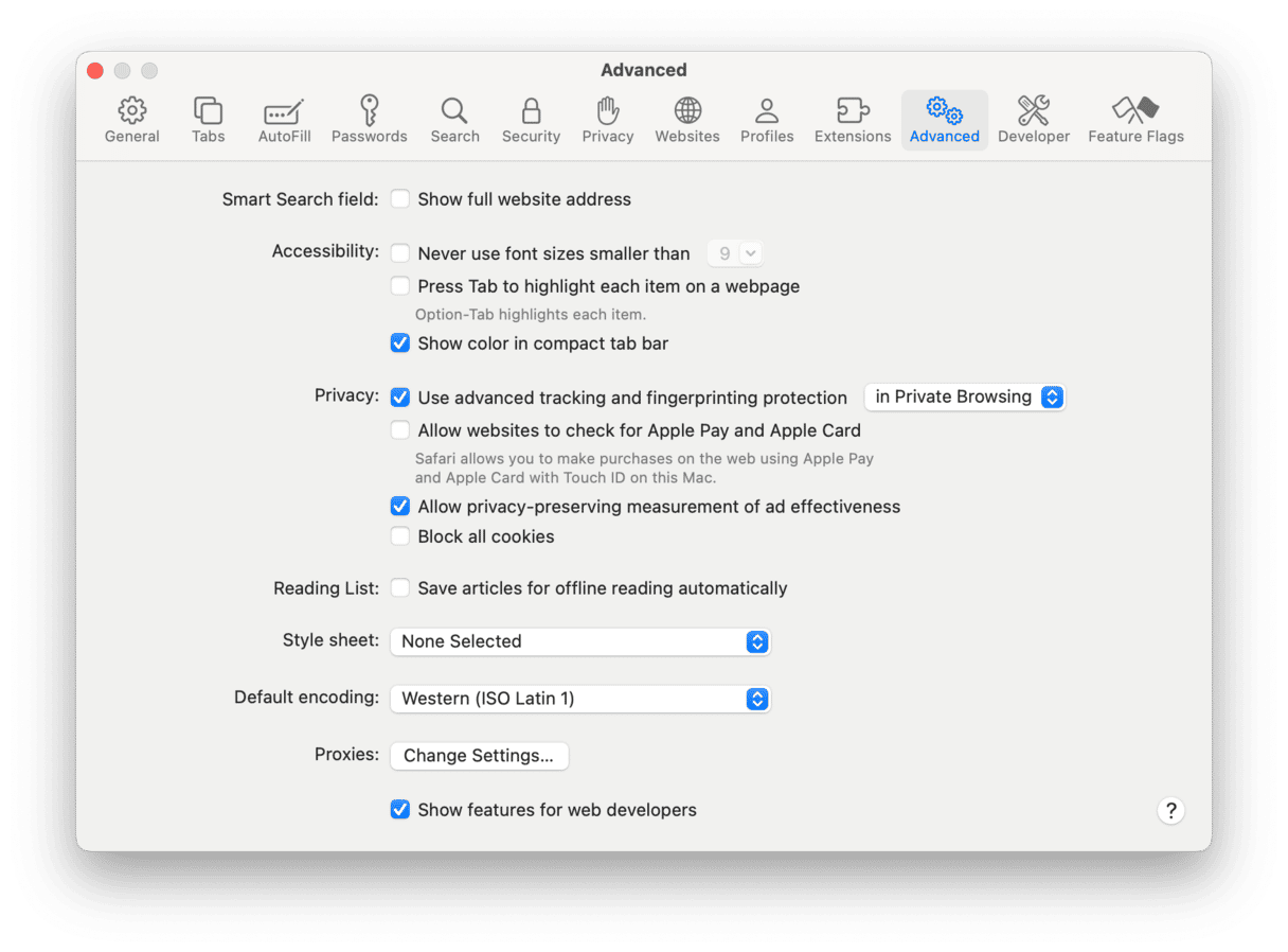 - Navigate to the Advanced tab and select the box "Show Develop menu in menu bar." In macOS Sonoma, it is named "Show features for web developers."