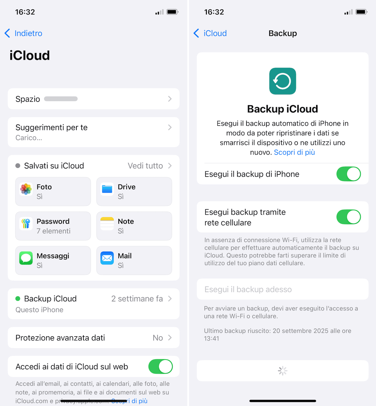 Se il pulsante è attivo ed è verde, significa che tuo iPhone esegue il backup su iCloud e vedrai la data dell'ultimo backup. In caso contrario, attivalo cliccando su Esegui il backup.