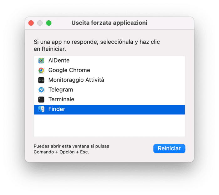 - Premi Opzione + Comando + Esc per aprire il menu Uscita forzata.