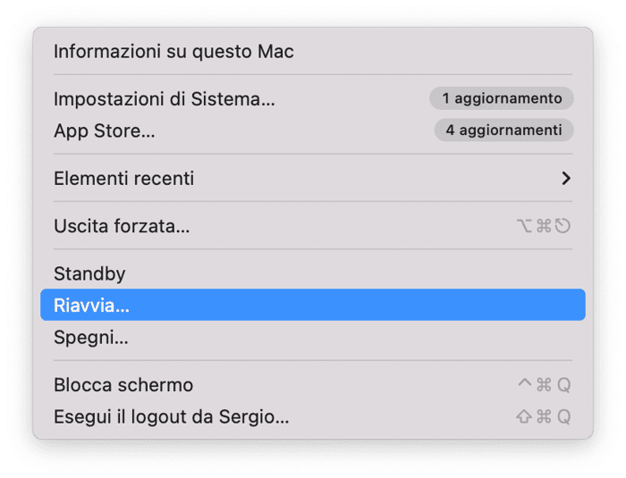 Riavviare il Mac consente di cancellare file temporanei, dati cache ed errori di sistema che possono influire sulle icone della Scrivania e sulle prestazioni in generale. Per concedere al tuo Mac una boccata d'ossigeno, clicca sul menu Apple e seleziona Riavvia. Dopo il riavvio, controlla se il problema è stato risolto.