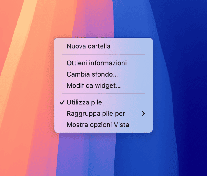 Le Pile aiutano a organizzare la Scrivania raggruppando i file simili, ma spesso possono rendere più difficoltoso trovare e gestire i singoli elementi. Puoi espandere le pile semplicemente cliccandoci sopra. Per disattivare del tutto le Pile, fai Controllo + clic sulla Scrivania e deseleziona Utilizza pile.