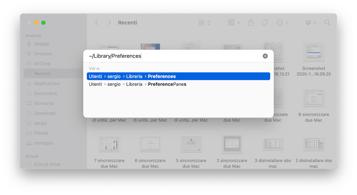 ~/Libreria/Preferencese premi Invio. - Cerca i due file qui sotto, trascinali nella cartella Documenti e riavvia il Mac: