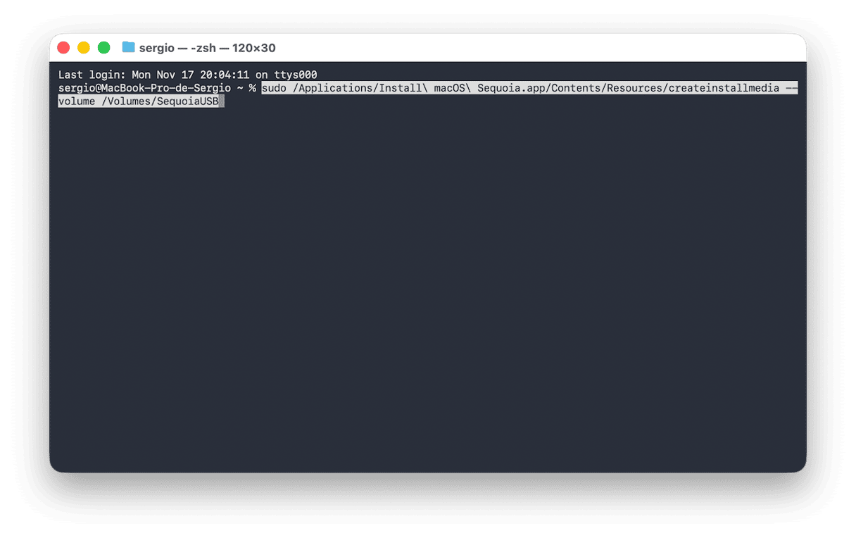 - Ora, copia e incolla esattamente questo comando nel Terminale, sostituendo SequoiaUSB, se hai dato alla tua pennetta USB un nome diverso: