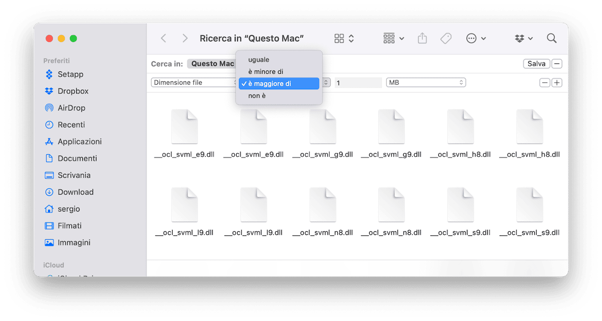 Ricorda di selezionare Questo Mac per ottenere un elenco completo di risultati. Vedrai quindi tutti i file la cui dimensione è maggiore di quella da te specificata. Esamina i documenti trovati e rimuovi gli elementi inutili che occupano troppo spazio sul tuo Mac.