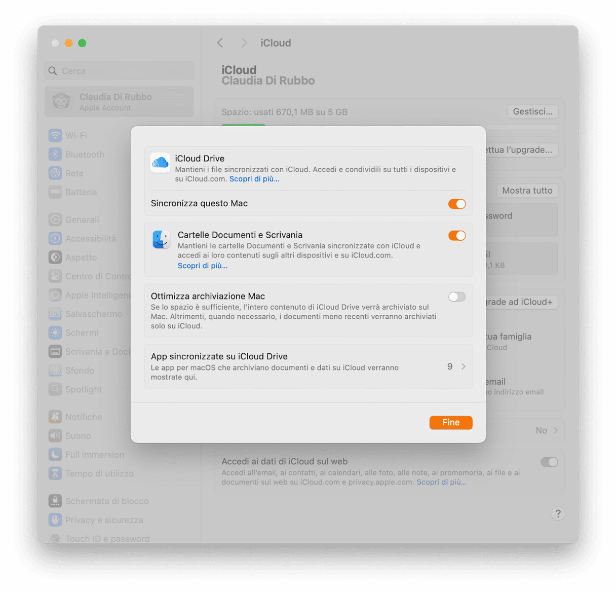 Se hai notato un picco nell'utilizzo della CPU da parte di fileproviderd quando usi iCloudDrive, puoi provare a disattivare e riattivare la sincronizzazione. Per farlo, vai in Impostazioni di Sistema > ID Apple > iCloud > iCloud Drive. Disattiva l'opzione Sincronizza questo Mac, aspetta un minuto circa e poi riattivala.