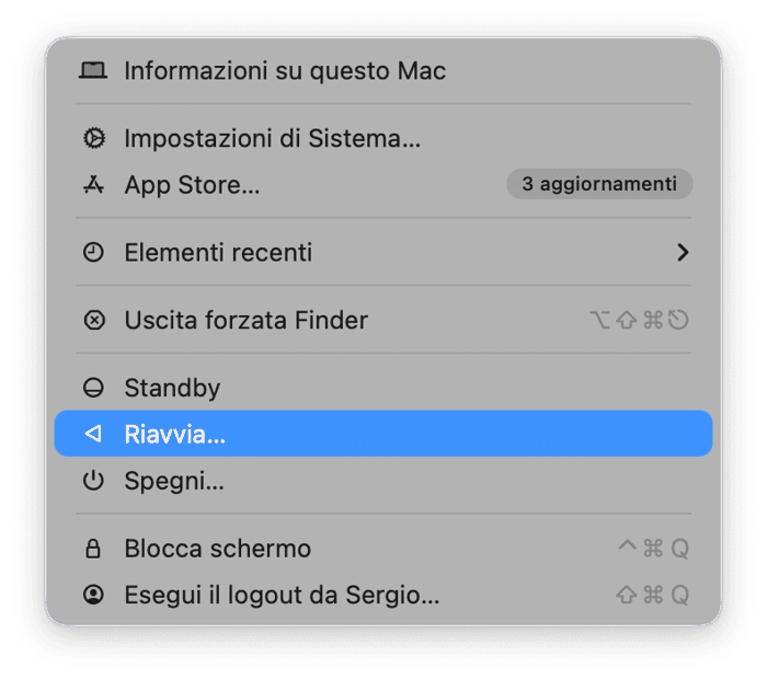 È la prima cosa da fare quando riscontri un problema con un'app sul Mac. Riavviare il Mac consente di cancellare i file temporanei, di svuotare le cache e di eseguire controlli sul disco di avvio. In molti casi, è sufficiente a risolvere il problema. Quindi, vai nel menu principale Apple e seleziona Riavvia.