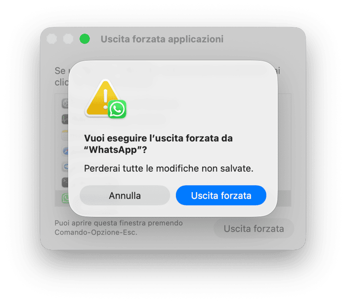 Se WhatsApp sul tuo Mac non risponde, puoi chiuderlo forzatamente. Premi Comando + Opzioni + Esc per richiamare la finestra Uscita forzata, poi scegli WhatsApp e clicca Uscita forzata.