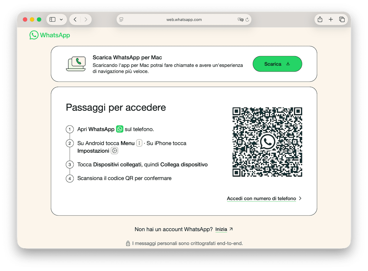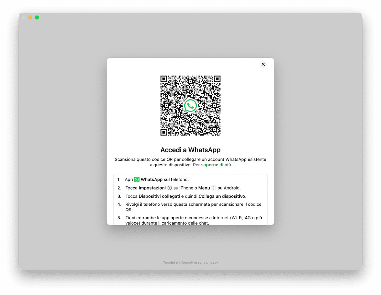 Consiglio: se per qualche ragione il codice QR non compare, esegui l'uscita forzata da WhatsApp. Poi, vai nella cartella Applicazioni e cerca WhatsApp. Premi Maiuscole e fai doppio clic sull'icona dell'app. In questo modo avvierai l'app in modo sicuro e dovresti riuscire a vedere il codice QR.