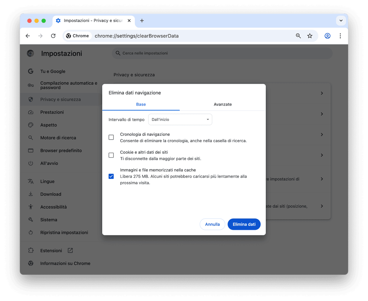 - Vai in Impostazioni > Privacy e sicurezza > Elimina dati di navigazione.