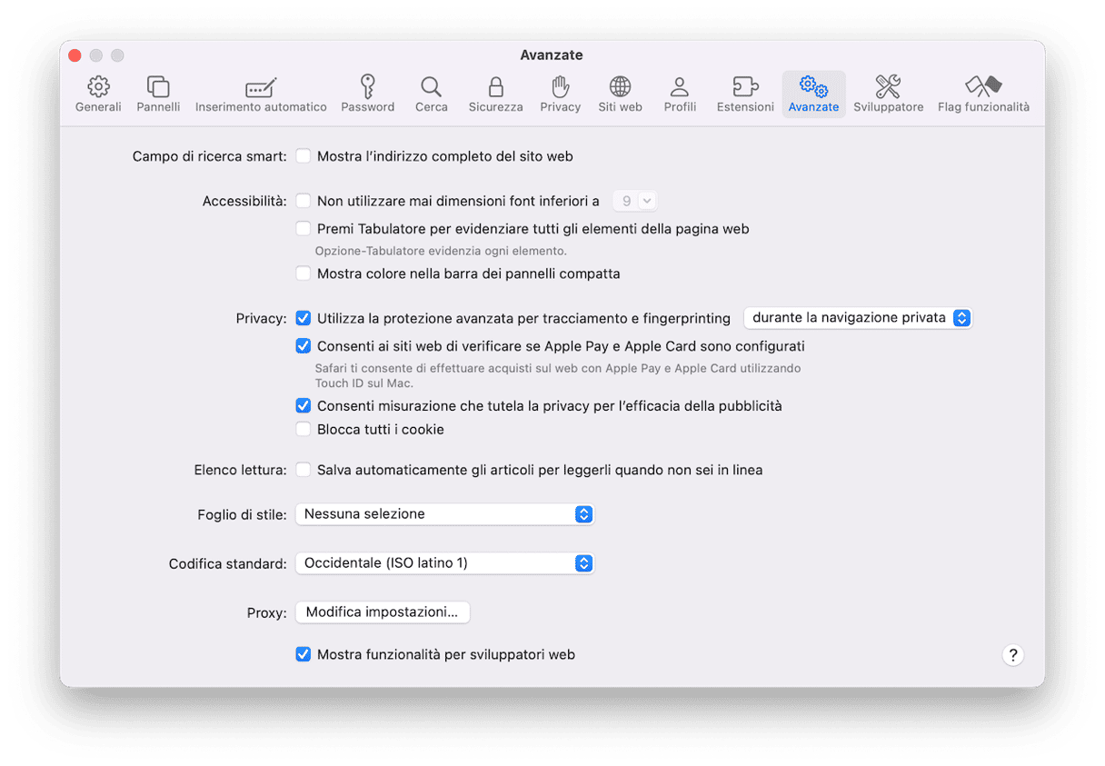 - Nella scheda Avanzate, spunta la casella "Mostra menu Sviluppo nella barra dei menu" (mostra funzionalità per sviluppatori web in macOS Sequoia).