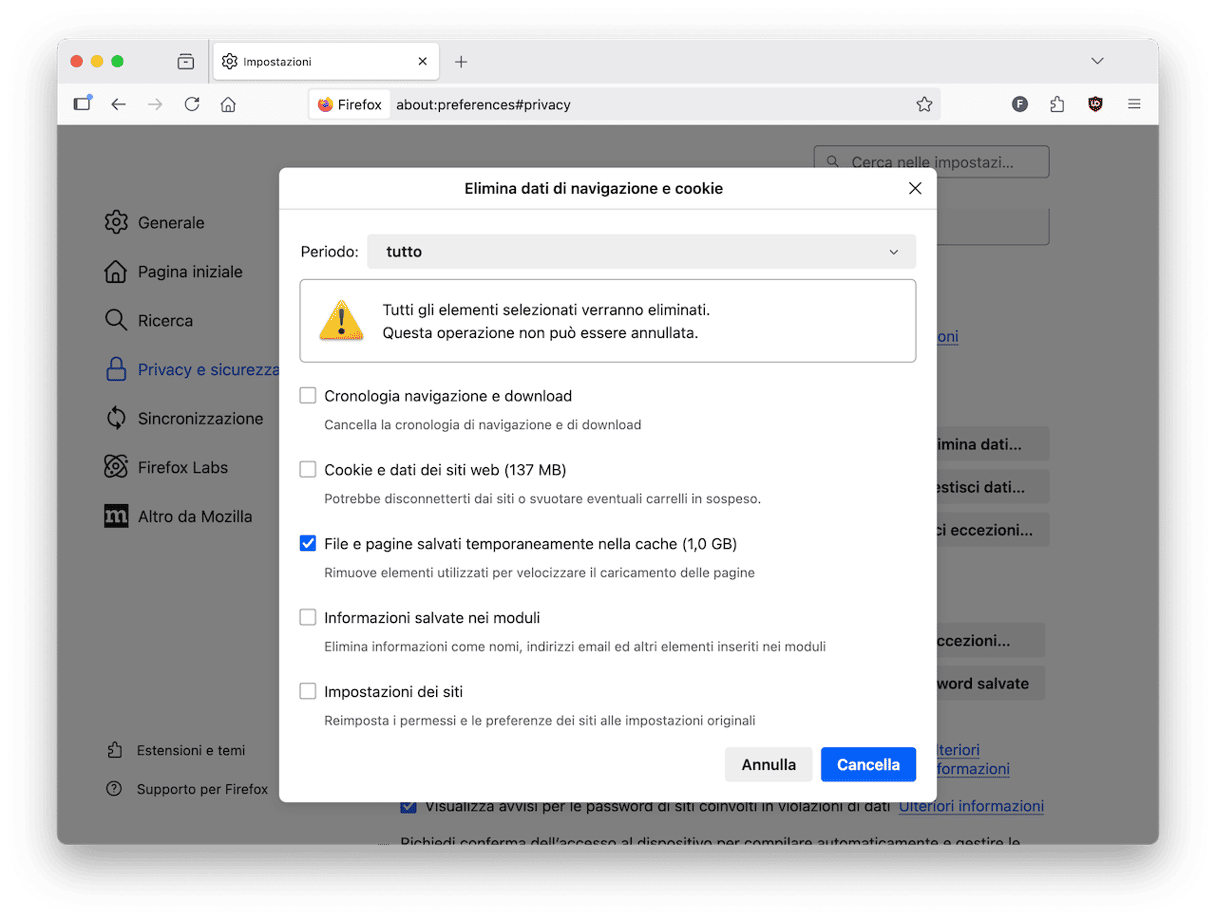 - Spunta "File e pagine salvati temporaneamente nella cache" e premi Elimina.