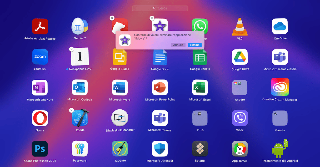 Noi preferiamo cancellare le app tramite il Launchpad perché è più divertente. Apri il Launchpad nel Dock. Poi, premi il tasto Comando e tieni premuta l'icona di un'app qualsiasi finché non iniziano a vibrare tutte. Vedrai il simbolo [X] sopra l'icona, fai clic per eliminare l'app.