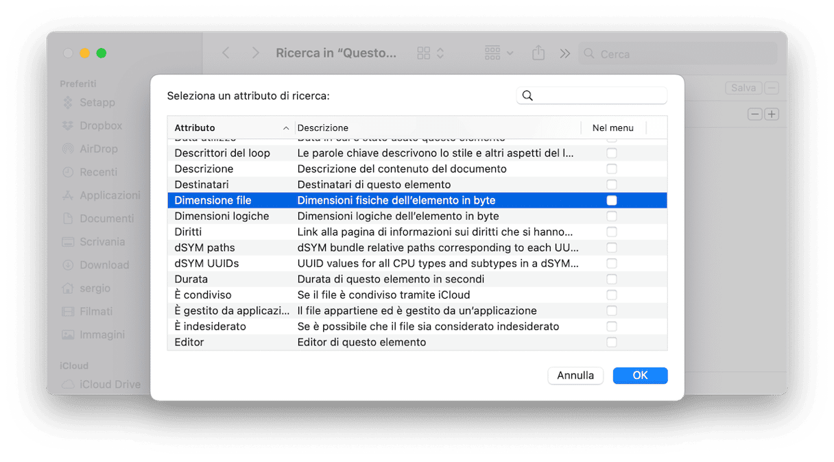 Ben fatto! Ora, cliccando sul tasto +, puoi inserire diverse estensione di file e ordinare i risultati per dimensione (segui i passaggi sopra, scegliendo Estensione file dall'elenco Altro...). Ti consigliamo di iniziare con i file .DMG o con i programmi di installazione delle applicazioni. Sono solo un peso morto e puoi farne a meno. Lo stesso vale per gli archivi ZIP.