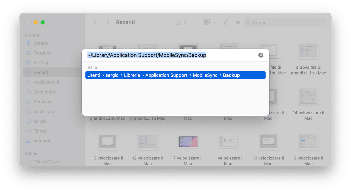 - Incolla: ~/Libreria/Application Support/MobileSync/Backup e premi il tasto invio.