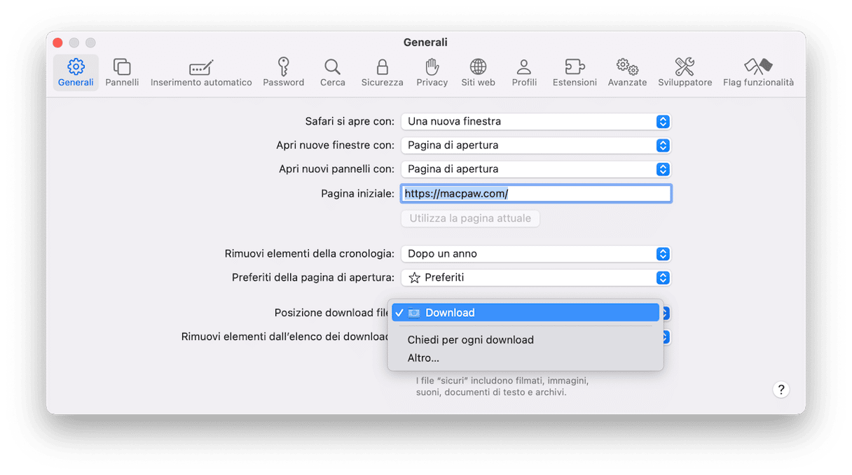 - Safari: Impostazioni > Generali (accanto a Posizione download file)