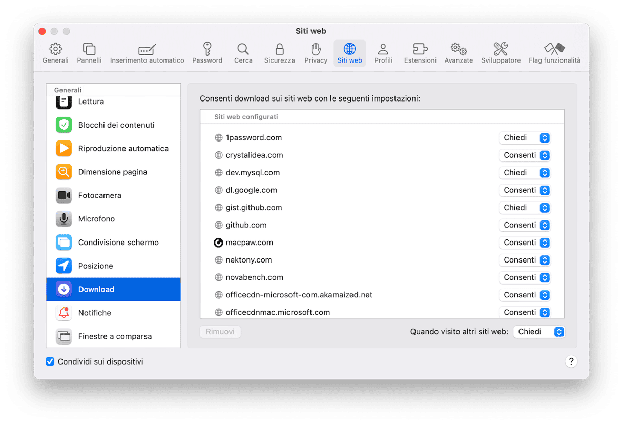 - Safari: vai in Impostazioni > Siti web > Download e controlla quali siti hanno il permesso.