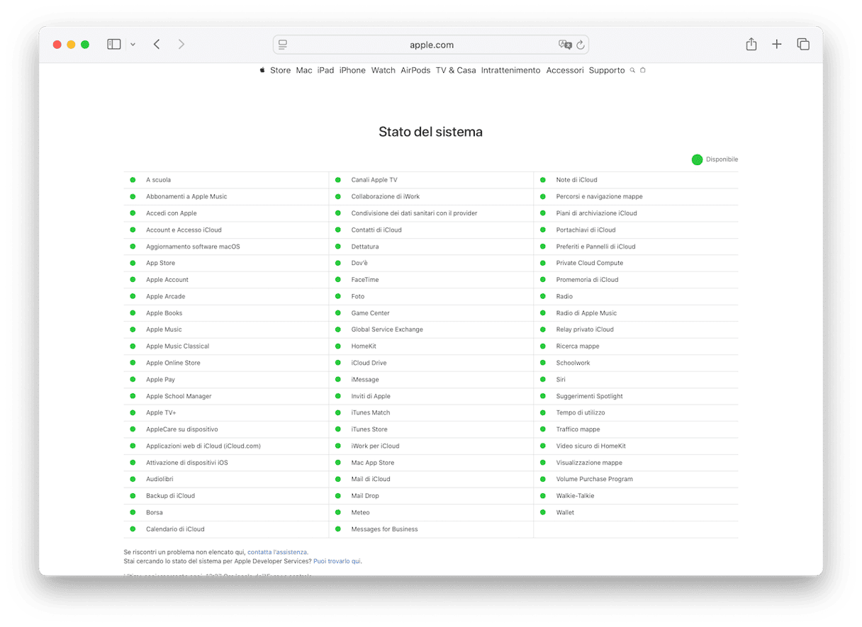 Se il file che stai tentando di scaricare proviene dall'App Store o da un altro servizio Apple, oppure si trova su iCloud, potrebbe esserci un problema con i server Apple. Per controllare, apri questo link da browser. Cerca il servizio da cui vuoi scaricare il file, ad esempio l'App Store del Mac o lo spazio di archiviazione di iCloud. Se accanto al servizio vedi un pallino verde, è tutto a posto. In caso contrario, c'è un problema. Non puoi far altro che aspettare che venga risolto.