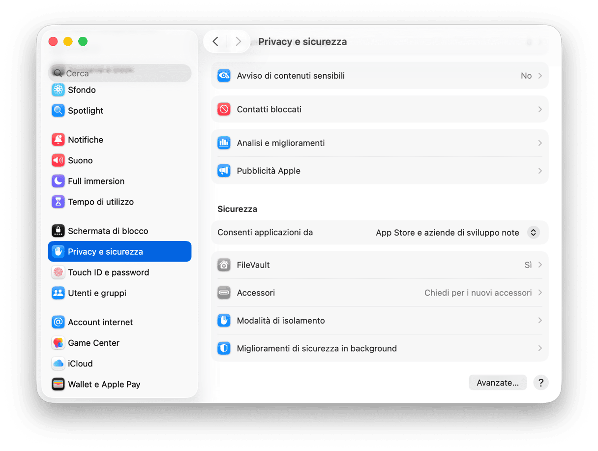 Se stai cercando di scaricare un'app dal sito web di uno sviluppatore, forse le tue impostazioni di sicurezza te lo impediscono. Per controllare, clicca il menu Apple e scegli Impostazioni di Sistema > Privacy e sicurezza. Sotto Sicurezza, assicurati che ci sia la spunta accanto a "App Store e sviluppatori identificati".