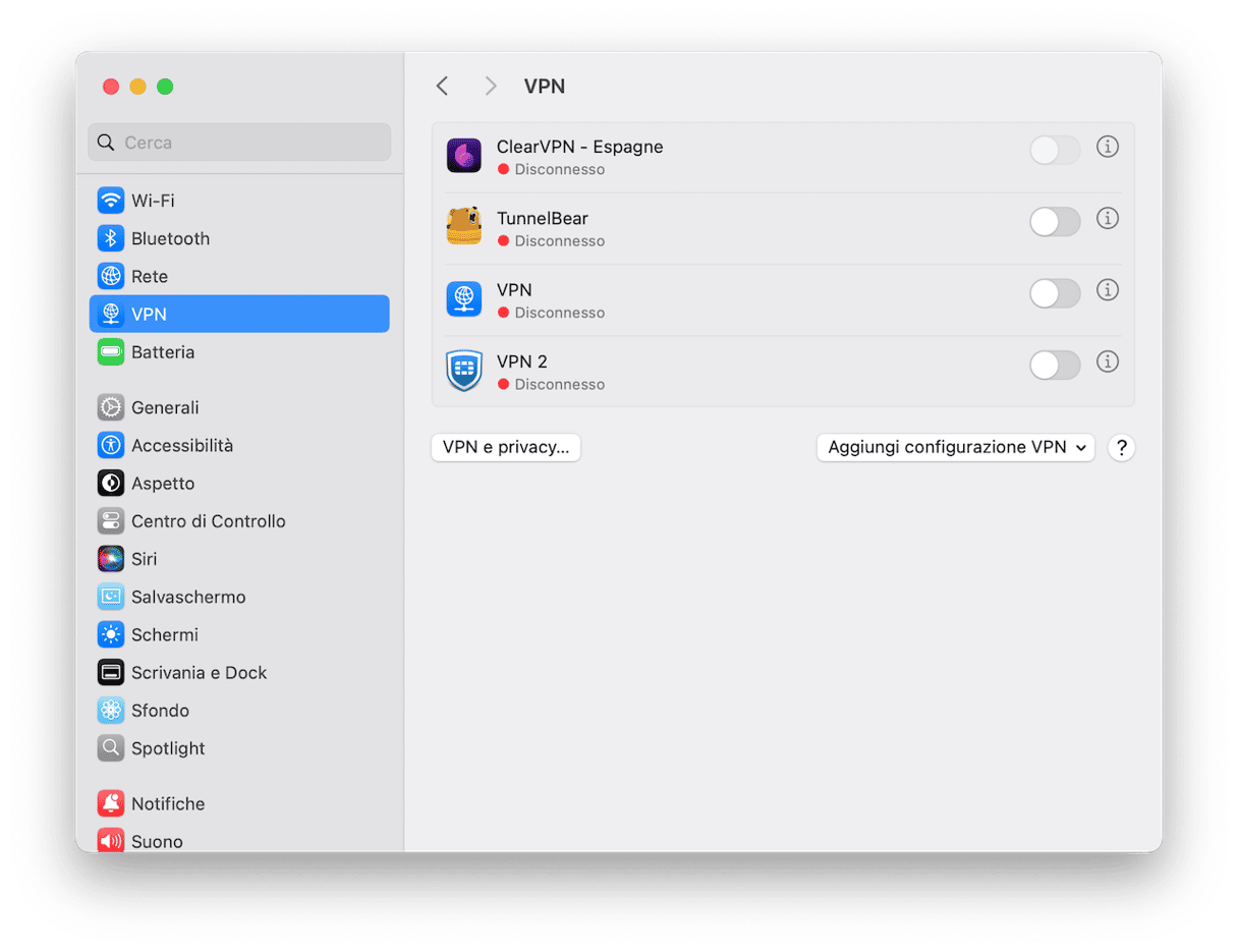 Quindi, per spegnere la VPN, vai in Impostazioni di Sistema > VPN e disattiva la VPN. In alternativa, clicca l'icona della VPN nella barra dei menu e disattivala.