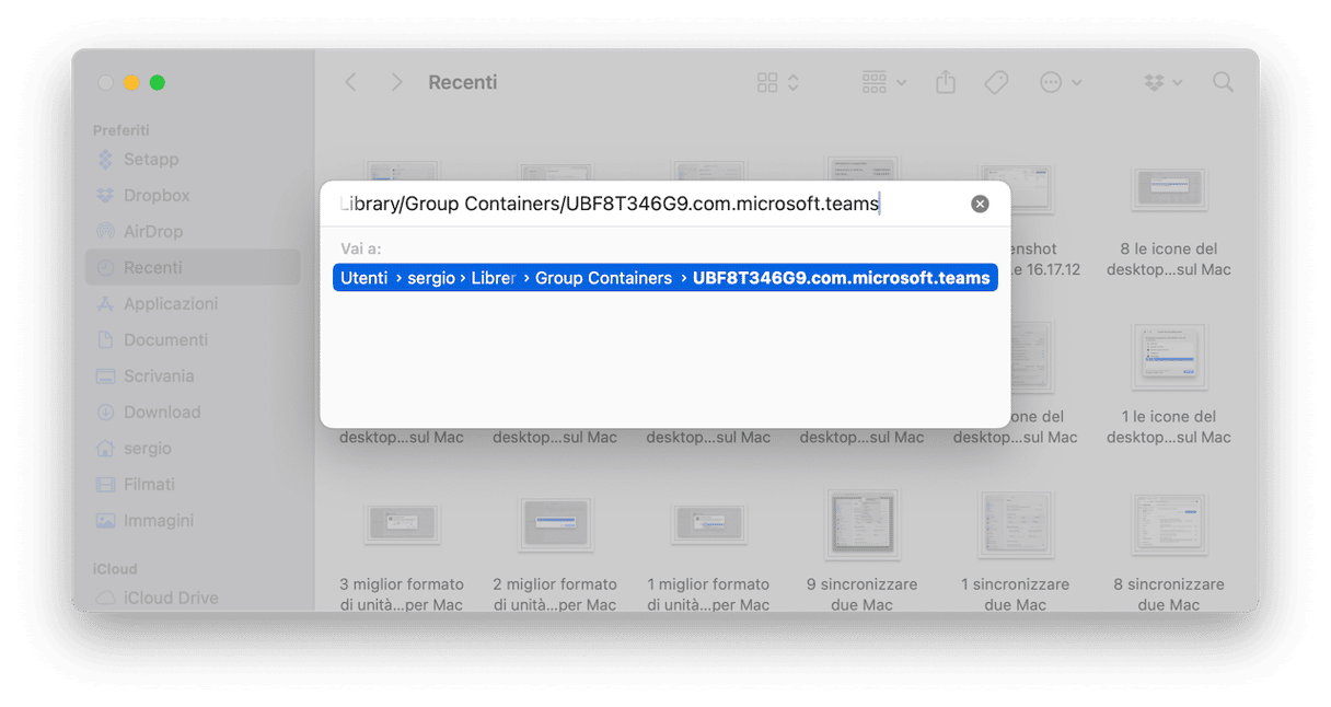 - Incolla questo percorso e premi Invio: ~/Libreria/Group Containers/UBF8T346G9.com.microsoft.teams