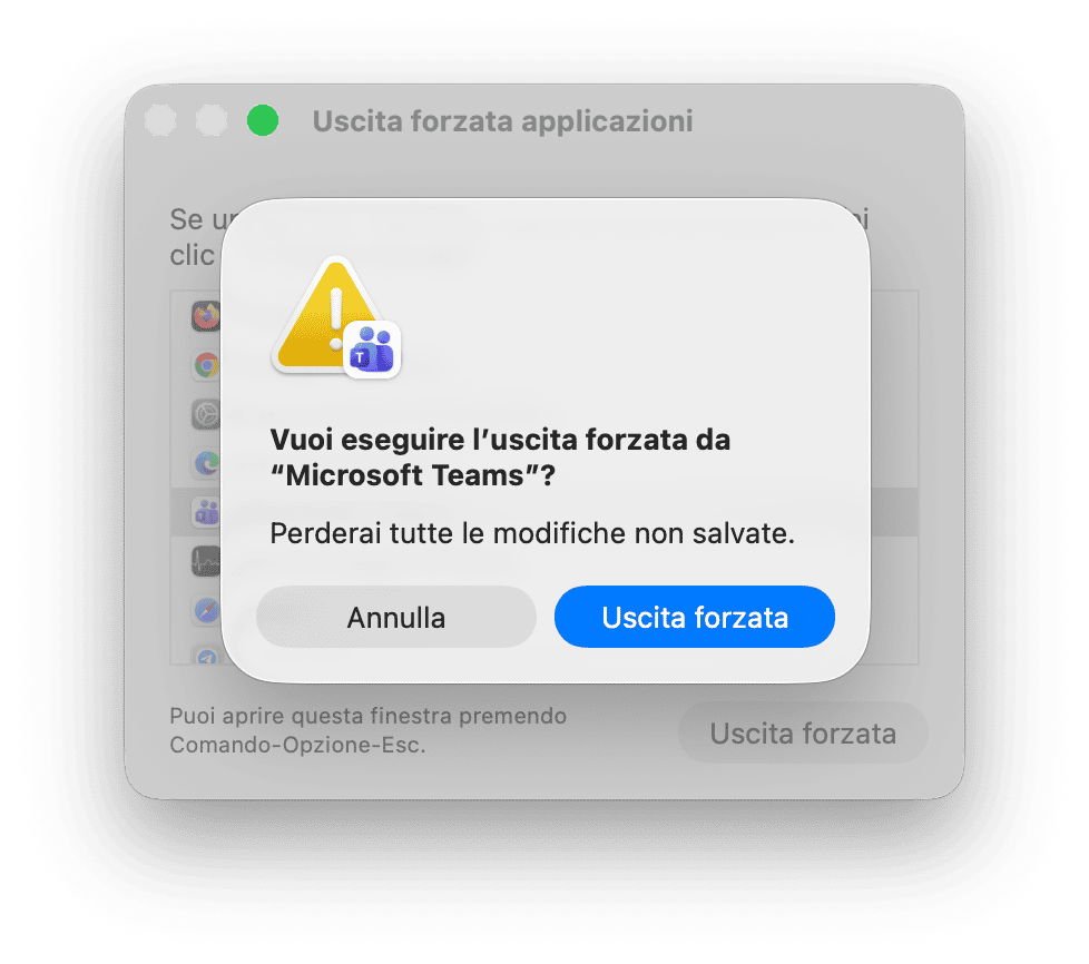 Se Teams rimbalza nel Dock ma non si avvia, fai clic destro oppure Controllo + clic sull'icona e scegli Esci. In alternativa, premi Comando + Opzione + Esc, scegli Teams e clicca Uscita forzata. Poi, prova a riaprire l'app.