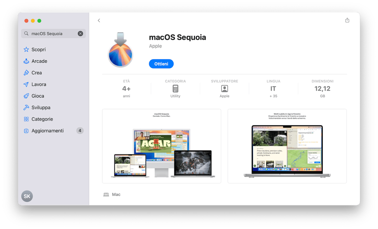 Per trovare la versione di macOS che ti serve, digita il nome di macOS nella barra di ricerca e clicca Ottieni. Verrà avviato il download dell'installer. Al termine, fai doppio clic per installare l'aggiornamento.