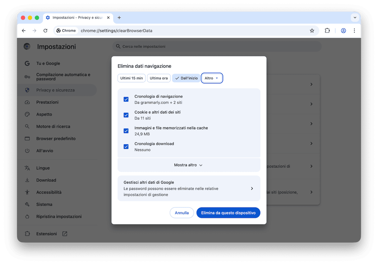 - Clicca Chrome > Impostazioni > Privacy e sicurezza > Elimina dati di navigazione.