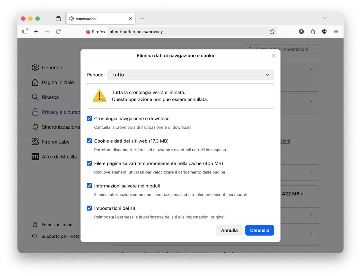 - Scegli "tutto" accanto a Periodo, spunta tutte le caselle e clicca Cancella.