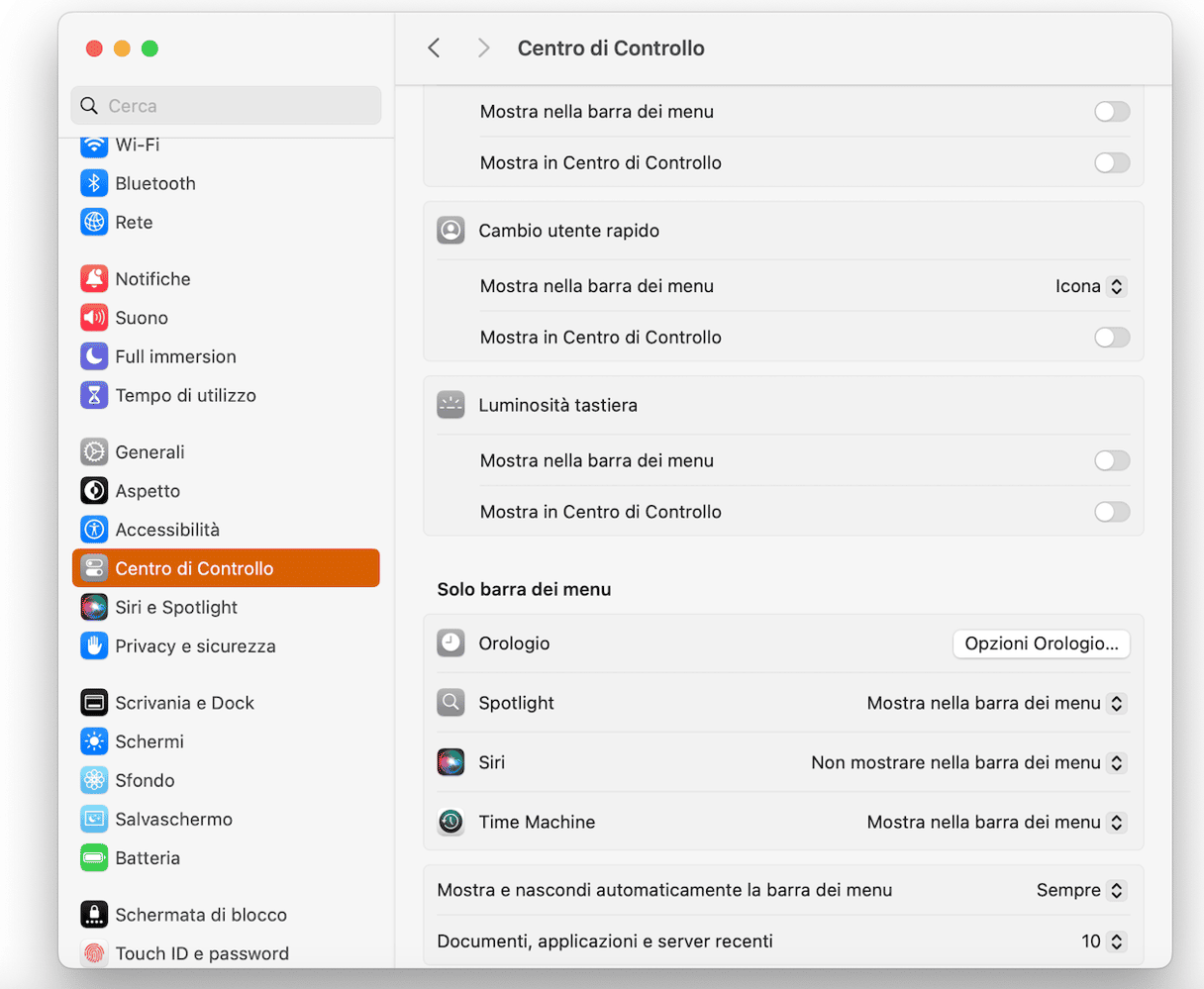 Se per qualche ragione, non riesci a vedere l'icona di Time Machine nella barra dei menu, vai in Impostazioni di Sistema > Centro di controllo e seleziona Mostra nella barra dei menu, accanto a Time Machine.