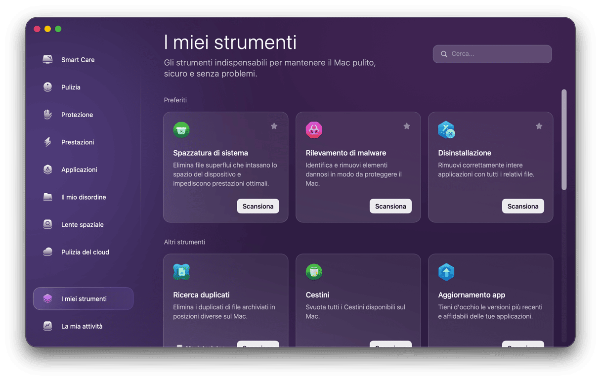 E se vuoi accedere più rapidamente allo strumento Disinstallazione, puoi provare la nuova funzionalità: I miei strumenti. Con essa puoi passare direttamente alla disinstallazione delle app senza avviare la scansione in Applicazioni. Puoi anche aggiungerla ai Preferiti, insieme a tutti gli altri strumenti che utilizzi più di frequente.