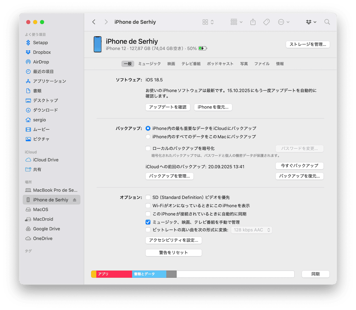 - Finderのサイドバーの「場所」の下からそのデバイスを選択します。 デバイスが表示されない場合は「Command + カンマ」キーを押してFinderの設定を開いて「サイドバー」のタブの「場所」の欄から「CD、DVD、およびiOSデバイス」のチェックボックスをオンにします。
