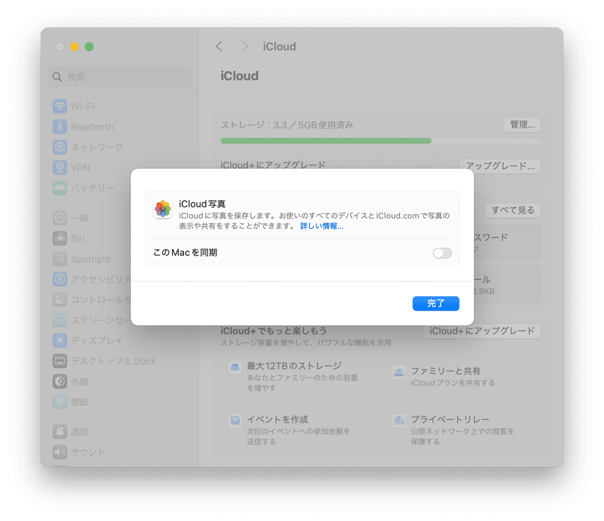 これで同期がオフになり、Macの写真アプリにおいて行った変更はiCloudと同期されなくなるので、写真を安全に削除できるようになります。