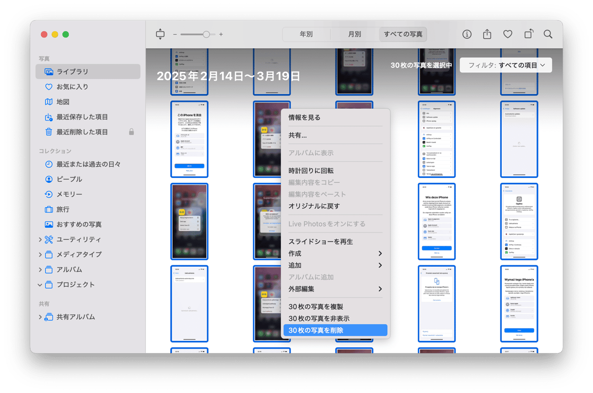 - 「削除」をクリックするか、写真を右クリックして「‘xxxxx’枚の写真を削除」を選択します。