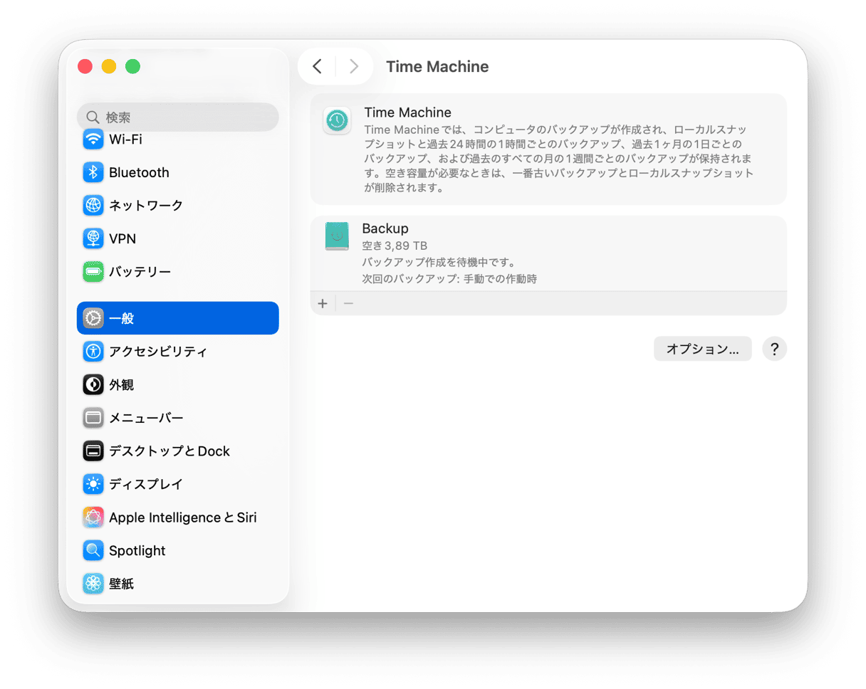 Time Machineの設定はとても簡単です。外付けハードドライブを用意して「システム設定」>「一般」>「Time Machine」に進んで設定するだけです。