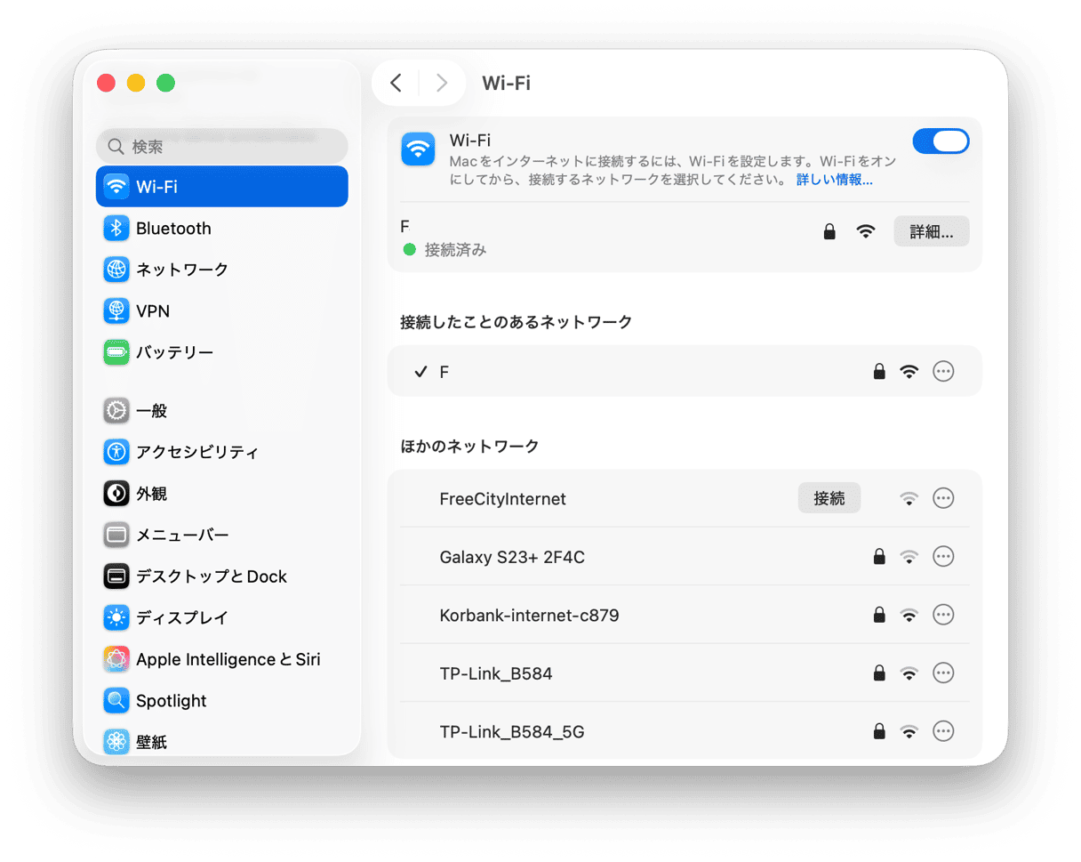 MacBook AirがWi-Fiに接続できないのに、他のデバイスは接続できる場合、そのネットワークをMacに忘れさせることが次に試すべきことです。 その場合には、Wi-Fiパスワードを再び入力する必要があり、接続が完全に更新されます。 メニューバーのWi-Fiアイコンをクリックして「Wi-Fi設定」を選択します。 ネットワーク名の横の「詳細」をクリックして「このネットワーク設定を削除」をクリックします。 次に、メニューバーのWi-Fiアイコンをもう一度クリックして「ほかのネットワーク」の横の矢印をクリックします。 Wi-Fiネットワークを選択して、ユーザー名とパスワードを入力します。 これまでに挙げた他の解決策と同様、この方法はどのMacのモデルでも有効です。