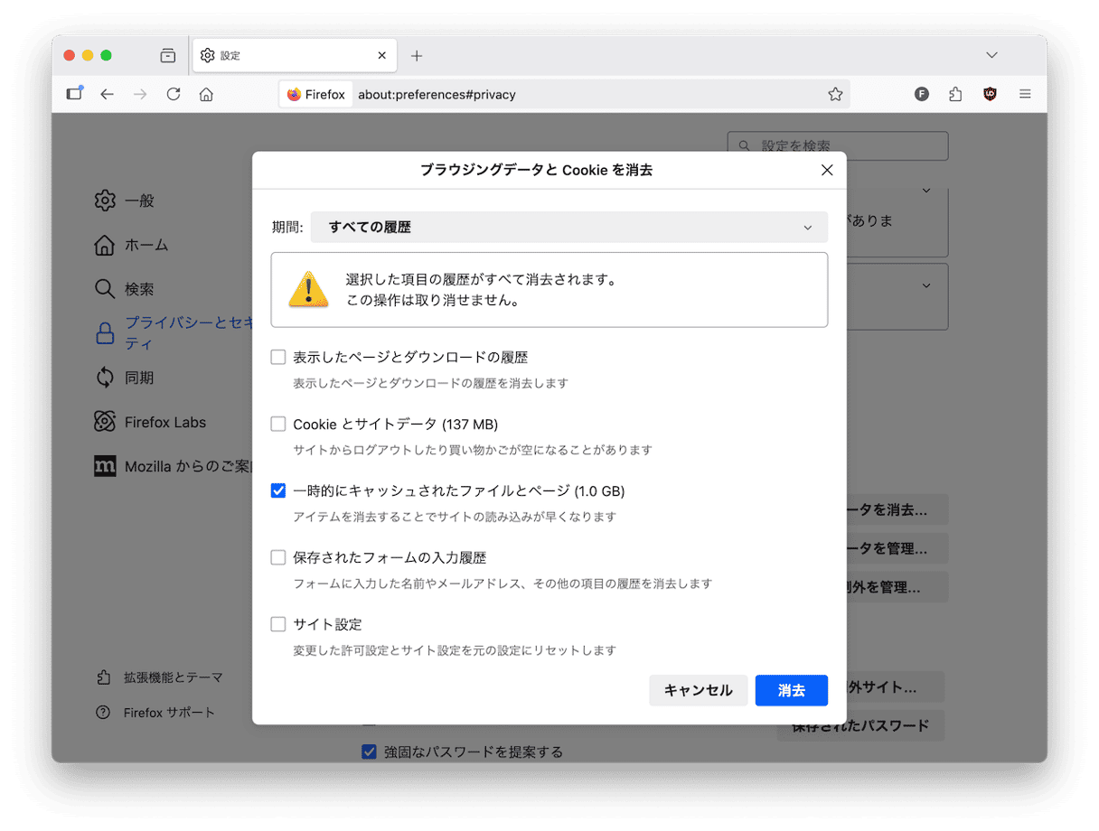 - 「一時的なキャッシュファイルとページ」にチェックを入れ、キャッシュを消去しましょう。