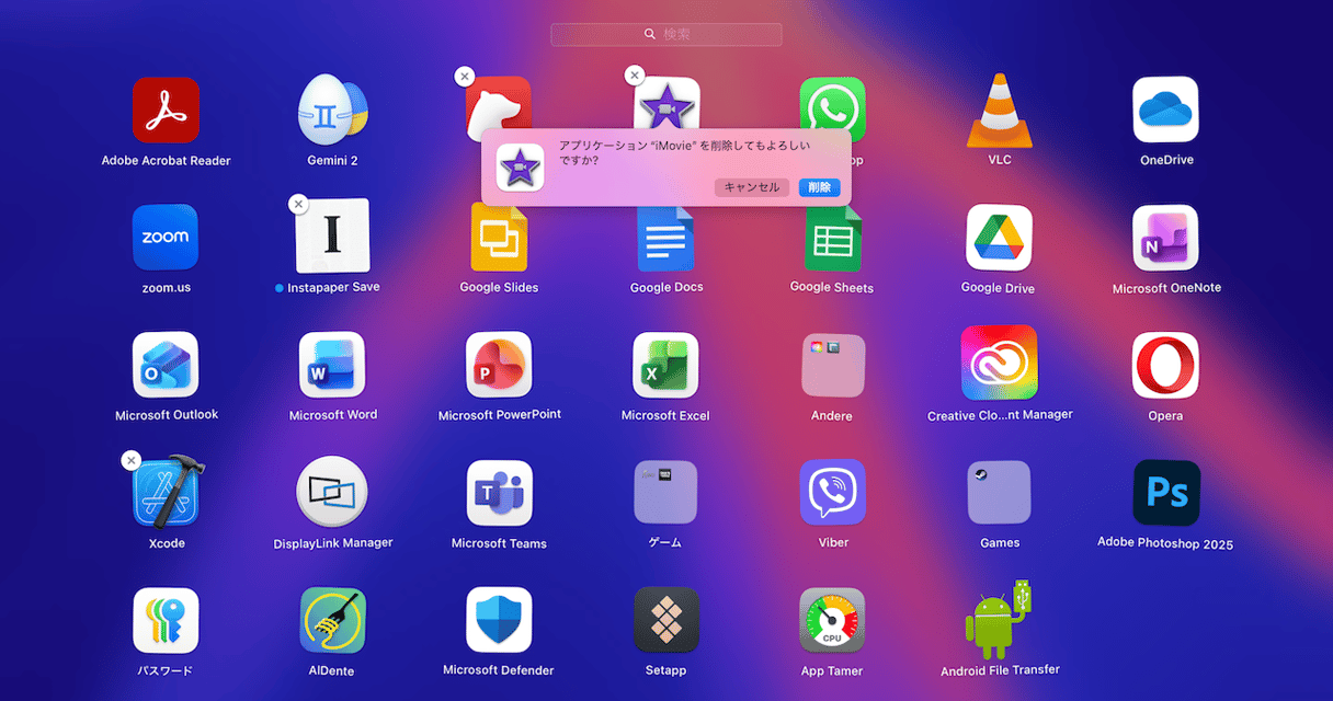 Launchpadを使ってアプリを削除するのも良い方法です。 DockからLaunchpadを開きましょう。 コマンドキーを押しながら、アプリが揺れ始めるまで、削除したいアプリのアイコンを押し続けます。 アイコンの上に[X] マークが表示されるかと思います。 - それをクリックすると、アプリを削除できます。