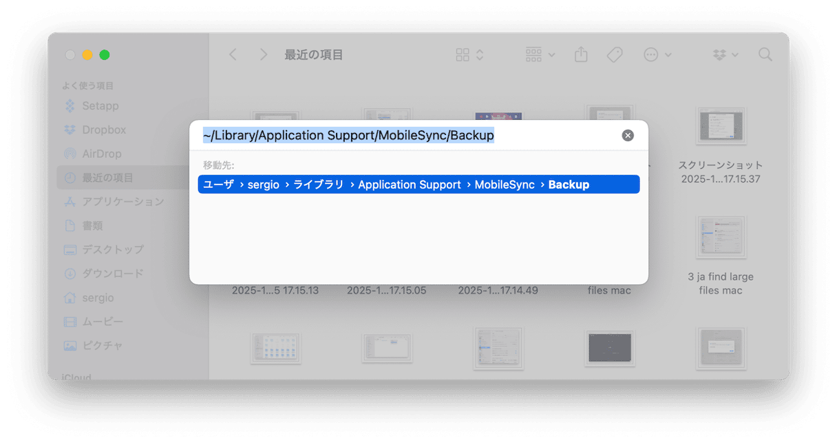 - ~/Library/Application Support/MobileSync/Backup を貼り付けて、エンターを押します。